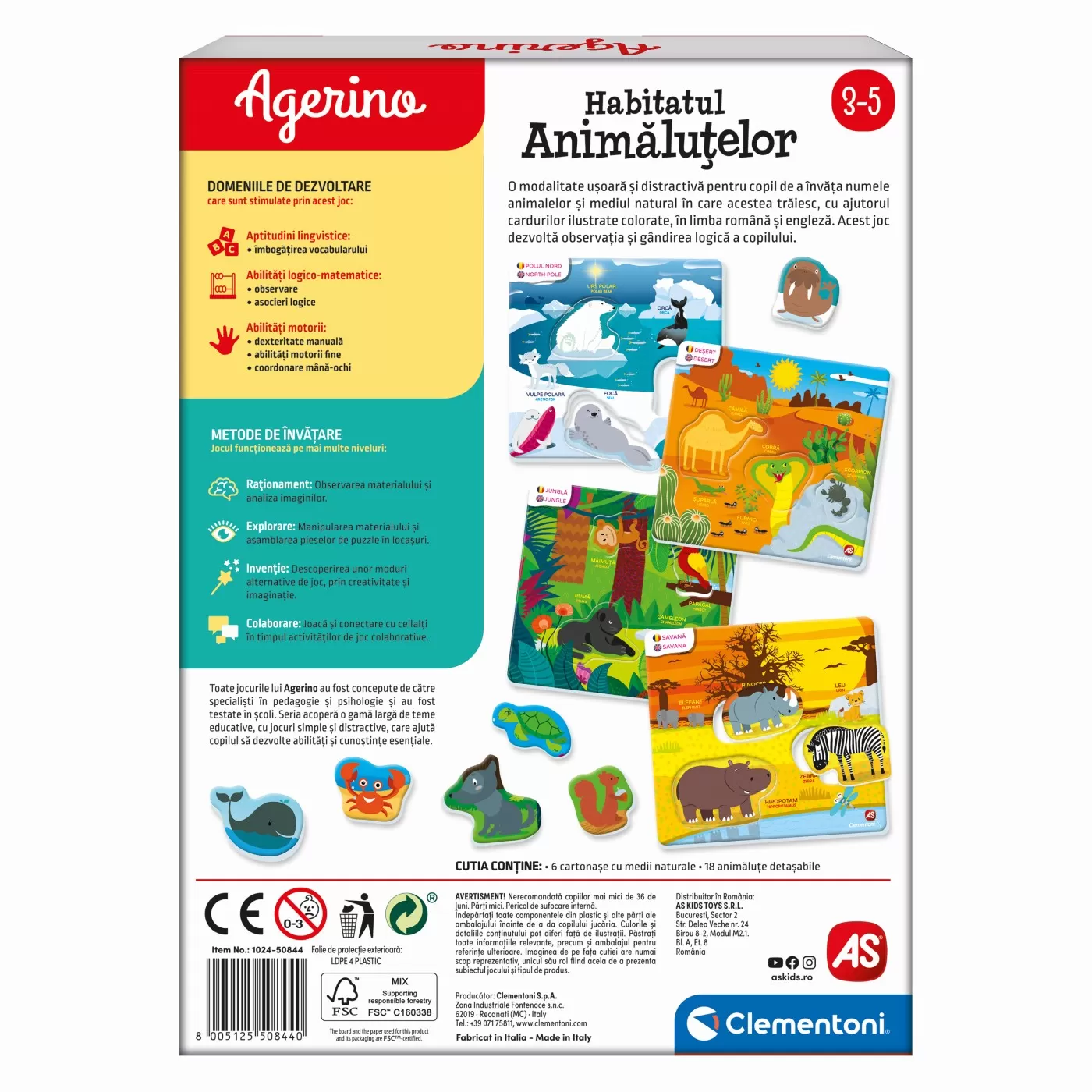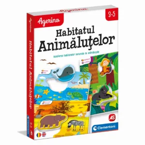 Habitatul Animalutelor este un joc educativ, simplu si distractiv pentru copiii de la 3 ani. Contine cartonase colorate cu notiuni in romana si engleza, pentru a facilitate invatarea denumirilor animalelor si habitatelor in 2 limbi. Aratati-i copilului o plansa cu un habitat. Descoperiti impreuna caracteristicile acestuia si animalele specifice. Prin joc copilul invata habitate precum Padurea, Savana, Polul Nord si Ferma etc. Jocul contine 6 planse mari cu habitatul animalelor si 18 piese de puzzle cu animalute. Valori dezvoltate logica, cunostinte despre lume, autonomia, sociabilitatea, memoria, limba straina, aptitudinile motorii. Toate jocurile lui Agerino au fost concepute de specialisti in pedagogie si psihologie si au fost testate in scoli. Varsta recomandata 3+.