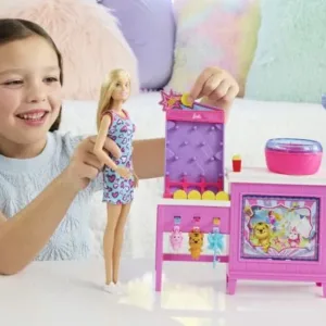 Papusa Barbie Malibu Detectivi pe plaja si setul de joaca cu 20 de accesorii! Inspirat din serialul de succes, acest set de joaca ii transporta pe fani intr-un spatiu de joaca cu o masina de vata de zahar. Copiii pot introduce o moneda in joc si o pot ajuta pe papusa Malibu sa aleaga un premiu exista un porc, un tigru si o roata si apoi sa se bucure de vata de zahar! Papusa Barbie &bdquoMalibu&rdquo este imbracata intr-o rochie casual cu model inima si poarta pantofi sport albi. Copiii vor adora sa recreeze scene si sa isi creeze propriile aventuri pe plaja! Papusa nu poate sta in picioare singura.
