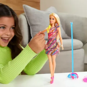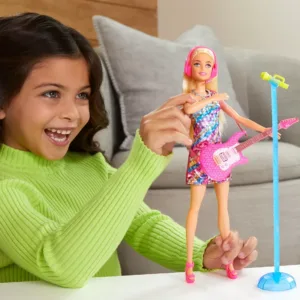 Imaginatiile pot retrai un moment magnific pe scena cu papusa &bdquoMalibu&rdquo Barbie in tinuta sa distinctiva de spectacol din Barbie Aventuri la New York! Gata pentru lumina reflectoarelor?Cand copiii ridica microfonul papusii Barbie spre gura , muzica va suna, rochia ei se va lumina, iar ea va canta una dintre cele doua melodii originale! Cand bratul este asezat la loc, muzica va continua sa sune, dar papusa Barbie nu va mai canta pana cand microfonul este ridicat din nou.