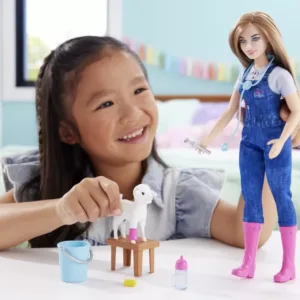 Sarbatoreste cea de-a 65-a aniversare a lui Barbie cu o colectie de papusi cu cai de cariera preferate, cum ar fi a fi veterinar la ferma. Papusa Veterinara Barbie&reg poarta o tinuta tematica cu pantofi roz iconici, iar setul include si 10 accesorii, inclusiv o oaie cu urechi mobile. Distractia este diversificata prin accesorii suplimentare, precum o banca, o galeata, echipament de examinare (un ciocan si un stetoscop in forma de inima) si 2 pansamente pentru oi. tinuta detasabila a medicului veterinar blond include salopete cu &bdquobuzunare&rdquo si cizme de ploaie roz, perfecte pentru o zi de munca la ferma.