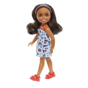 Papusile Barbie Chelsea vin cu pantofi si piese vestimentare detasabile. Creeaza povesti nenumarate cu scenarii diferite impreuna cu papusile Chelsea. Pentru scenarii creative achizitioneaza toate papusile Chelsea. Papusa Chelsea si prietenii ei sunt o sursa de inspiratie pentru a explora si imagina lumea inconjuratoare! Aceasta adorabila papusa Chelsea de 15 cm poarta o rochita albastra cu imprimeu colorat si bretele. Parul sau saten este accesorizat cu o bentita roz, iar aspectul ei este completat de sandale rosii.