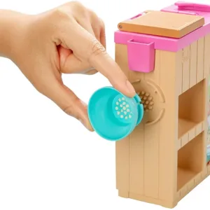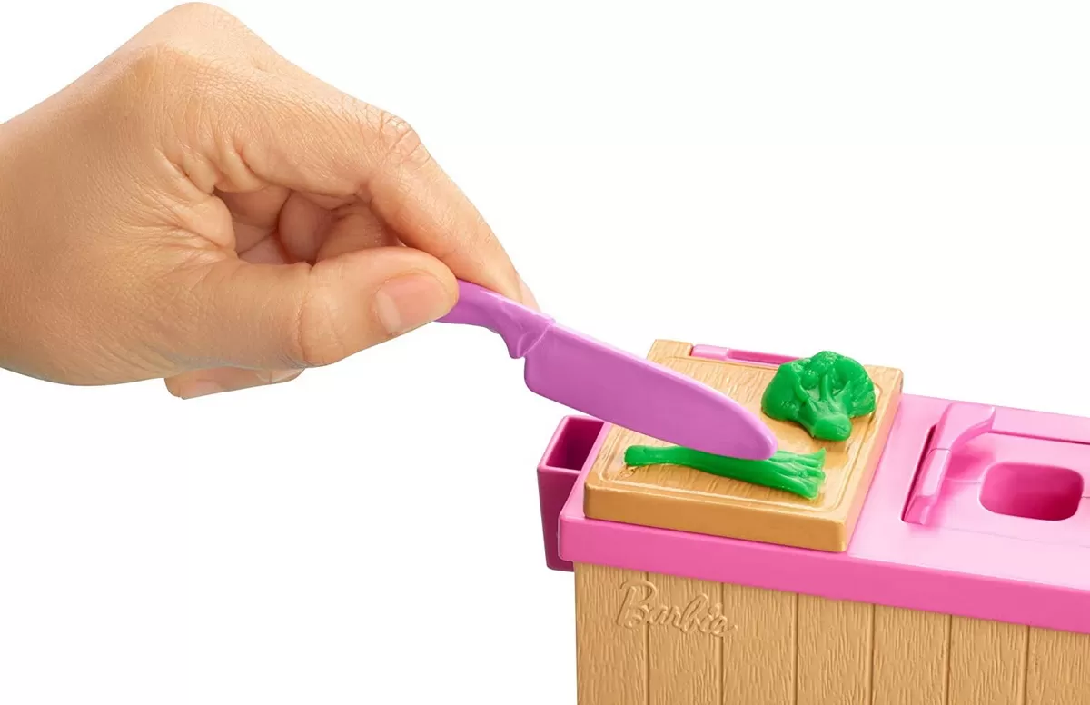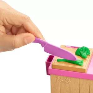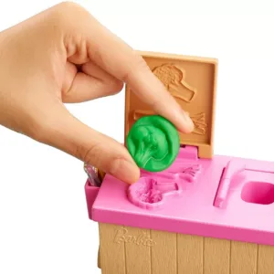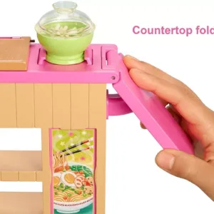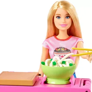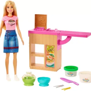 Cu acest set de joaca Pregateste Noodles Barbie ii inspira pe tinerii bucatari sa fie creativi in bucatarie si sa-si perfectioneze abilitatile culinare! Pentru a face noodles puneti aluatul alb in gaura de pe statia de lucru si bolul peste el, apoi impingeti maneta laterala in jos – si niste noodles apetisanti vor aparea. Acum este timpul sa adaugati niste legume, asa ca luati aluatul verde si puneti in formele de pe statia de lucru pentru a crea niste broccoli. Dupa ce sunt gata noodles Barbie este pregatita sa manance cu betisoarele. Atat de delicios!