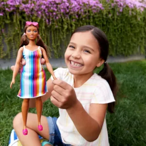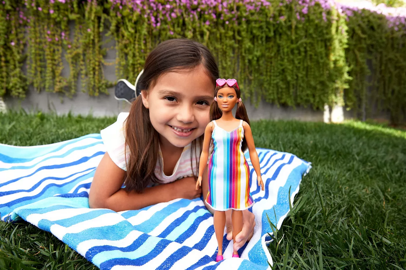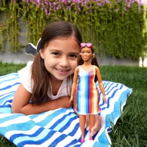 Colectia Barbie Loves the Ocean, o linie de papusi realizate din plastic reciclat. Avand tesaturi si accesorii din materiale reciclate, aceste papusi Barbie inspira povesti cu distractie la plaja! Fiecare papusa Barbie face furori intr-o tinuta pregatita pentru vara, cu tesaturi fabricate din plastic reciclat. Ochelarii de soare la moda, de asemenea, fabricati din plastic reciclat, completeaza aspectul lor pregatit pentru vara. Dispunand de ambalaje reciclabile si cu detalii pe care copiii le iubesc, papusile Barbie Loves the Ocean sunt cadouri grozave pentru copiii de la 3 la 7 ani. Papusile Barbie Loves the Ocean, realizate din plastic reciclat! tinuta papusii Barbie este fabricata din plastic reciclat si prezinta culori indraznete si imprimeuri distractive. Ochelarii de soare, de asemenea, fabricati din plastic reciclat, completeaza aspectul de plaja al lui Barbie. Fiecare papusa Barbie Loves the Ocean vine in ambalaj reciclabil certificate FSC. Aceasta pachet contine o papusa satena cu ochelari roz ce poarta o rochita in dungi de plaja iar in picioare are o pereche de papuci roz.