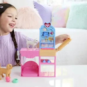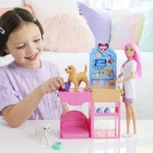 Barbie este gata sa aiba grija de prietenii sai necuvantatori in Clinica Veterinara Fast Cast! Acest set complet include o papusa Barbie veterinar, un catel, o pisica si peste 10 accesorii care transforma joaca intr-o experienta educativa si distractiva. Copiii pot folosi plastilina Barbie Dough pentru a crea bandaje, ghipsuri si tratament pentru animalele ranite. Cu halatul alb, stetoscopul si toate instrumentele necesare, Barbie este pregatita sa ofere ingrijire si afectiune pacientilor sai. Un set perfect pentru micii iubitori de animale si viitorii medici veterinari!