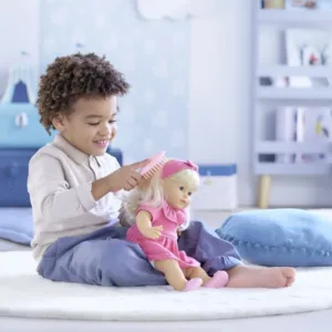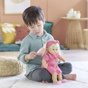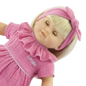 Jade este o papusa bebelus Corolle mare, pentru joaca si pentru a se comporta ca adultii. Masoara 36 cm, o dimensiune perfect potrivita bratelor mici ale unui copil pentru a fi alintat, ingrijit si pentru a reproduce actiunile care fac din maturizare o realitate. O papusa bebelus mare, cu pielea alba fata, bratele si picioarele, cu un parfum delicat de vanilie, sunt fabricate din vinil moale la atingere. Corpul ei este flexibil pentru o miscare usoara si poate sta in sezut. Degetul mare poate fi tinut in gura. Cu ochii ei albastri somnorosi, doarme cand sta intinsa pe spate. Este imbracata intr-o frumoasa salopeta roz si o camasa alba cu maneci lungi, cu model si guler Peter Pan. Pentru a-si completa tinuta, Jade poarta o bentita asortata si o pereche de balerini albi. Jade are o colectie completa de haine si accesorii Mon Grand Poupon Corolle pentru a imita actiuni de zi cu zi si a inventa scenarii de joaca multiple si variate. Potrivita pentru varste de la 2 ani in sus.