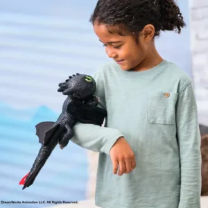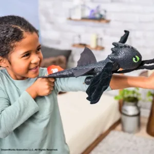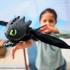 Indreapta-te spre ceruri cu Toothless! Aceasta jucarie de plus inovatoare prezinta dragonul iconic din Cum sa-ti dresezi dragonul cu detalii fidele filmului, inclusiv plus negru moale cu solzi stralucitori, gheare de pasla si ochi verzi stralucitori brodati. Toothless este gata sa isi ia zborul cu aripi mari, catifelate si moi, care ating 41 cm in diametru, permitandu-i sa planeze si sa te transporte pe Insula Berk! Pur si simplu fixati doua degete sub ghearele sale frontale, trageti inapoi si eliberati pentru ca Toothless sa zboare prin aer! Aripile sale moi se incolacesc apoi spre interior cu un pocnet pentru a va imbratisa bratul cand este timpul pentru o imbratisare. Fie ca este vorba de o zi de nastere, o sarbatoare sau orice alta sarbatoare, acest animal de plus dragon adorabil este un cadou impresionant pentru fanii How to Train Your Dragon si pentru toti cei carora le plac filmele de familie.