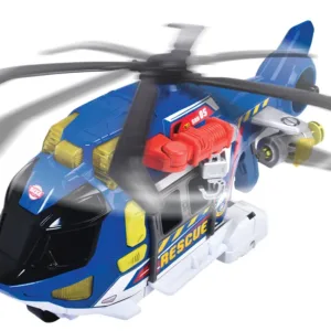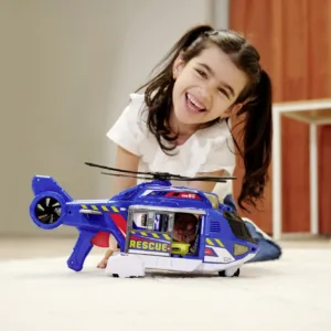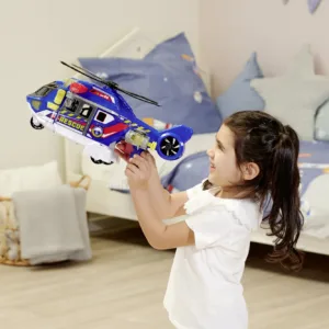 Dickie Toys Elicopter de jucarie mare pentru copii cu varsta de 3 ani si peste (39 cm) Elicopter de salvare cu troliu cu cablu, accesorii, efecte luminoase si sonore (include baterii). Acest elicopter de jucarie de la Dickie Toys este plin de functii distractive, inclusiv o elice rotativa, roti mobile si un troliu cu cablu pentru coborarea targii. Elicopterul este echipat cu o elice mecanica, care poate fi actionata prin intermediul unui buton amplasat pe maner. Dispune de un brat de macara pliabil cu troliu motorizat pentru ridicarea si coborarea carligului sau a targii, precum si de un tun lateral cu functie de tragere. Elicopterul reda sunete realiste, inclusiv sunete radio si sirena, insotite de efecte luminoase. Setul include baterii, o targa si 2 proiectile.