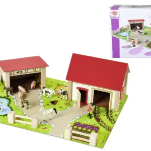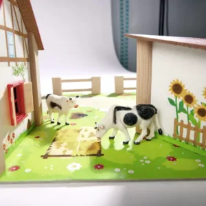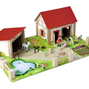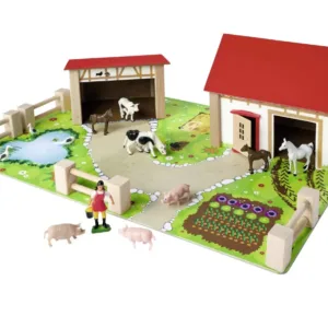 Placa de joaca cu dimensiunea de 36×51 cm creeaza o zona de joaca spatioasa. Fermierul si sotia fermierului locuiesc in ferma, iar animalele locuiesc intr-un grajd mare si confortabil. Ferma include gaste, vaci, porci si cai.