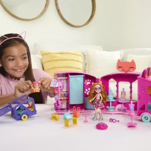 Enchantimals si prietenii lor animale au o petrecere Glam si toata lumea este invitata.Copiii isi pot pune in scena propriul spectacol de moda atunci cand Camionul Modei ajunge in oras cu o papusa Enchantimals inclusa.Deschide camionul si dezvaluie tot ce are nevoie un copil pentru a organiza o petrecere glam de moda.Este plin de elemente de moda suplimentara, manechine, o zona de vestiar, o masa si multe altele. Vei gasi 25+ piese de distractie de moda in total.