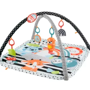 Salteaua de joaca cu activitati Fisher-Price Music, Glow and Grow Gym 3 in 1 este locul in care cel mic sa-si &bdquolumineze&rdquo joaca. Nou-nascutii se pot intinde, pot lovi si apuca 5 jucarii de activitate conectabile, inclusiv o oglinda, o jucarie zornaitoare moale arici, o jucarie de dentitie melc fara BPA, jucarie fosnitoare curcubeu si o vidra cu muzica si lumini. Vidra cu muzica si lumini reda 15 minute de muzica si proiecteaza o lumina delicata pentru a face joaca distractiva pe saltea sau separat!Pe masura ce bebelusul creste, scoateti cele doua arcade pentru stat pe burtica de pe salteaua mare si comoda, pentru a putea impinge in sus si activa muschii gatului si pe cei profunzi. In plus, culorile cu contrast ridicat pot contribui la dezvoltarea vizuala timpurie a bebelusului.Centru de activitati cu muzica si lumini cu 5 jucarii de activitate conectabile pentru bebelusi incepand de la nastere.Include 5 jucarii de activitate vidra cu muzica si lumini cu coada moale, oglinda de autodescoperire, jucarie zornaitoare moale arici, jucarie de dentitie melc fara BPA si jucarie fosnitoare curcubeu cu doua fete.Vidra portabila cu pana la 15 minute de muzica si lumini distractive.Urmarirea reflexiei lor in oglinda contribuie la autodescoperirea bebelusului, iar fetele mari ale personajelor ajuta la dezvoltarea vizuala a bebelusului.Saltea de joaca mare, 76 x 76 cm, cu culori cu contrast ridicat, poate fi spalata la masina pentru o curatare usoara.