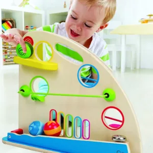 Jucarie cauza-efect! Bilele mari si colorate din lemn, gaurile de-a v-ati ascunselea si pistele rapide, creeaza un munte cu trasee pe doua fete, ca la final, o sonerie sa anunte sfarsitul cursei. In timp ce bilele se rostogolesc pe pista, vorbiti-i copilului despre concepte precum rapid/lent, intrare/iesire, sus/jos, stanga/dreapta, intr-un mod jucaus. Copii adora miscarea bilelor in timp ce descopera bucuria de a ghida obiectele prin gauri, pe masura ce se rostogolesc pe pista, iar copii mai mari se vor bucura sa isi dea seama si de inginerie si functionalitate. Ajuta la dezvoltarea coordonarii mana-ochi, creativitate, indemanare si a gandirii logice. Jucariile sunt realizate din lemn, folosind materiale ecologice, vopsite in culori atragatoare cu vopsele nontoxice, care depasesc cele mai inalte si stricte standarde internationale de siguranta si calitate, precum EN71, ISO9001, ASTM F963 si altele. De multi ani, Hape a creat jucarii fantastice, de inalta calitate, folosind materiale ecologice si durabile, fiecare produs fiind atent proiectat pentru a stimula abilitatile senzoriale, fizice si emotionale.