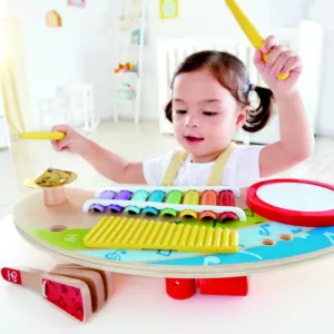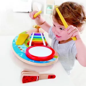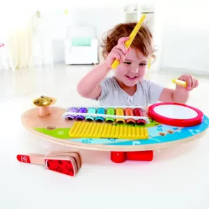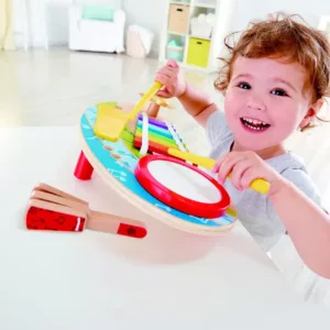 Copilul este pasionat de muzica? Sau de zornaitoare si alte jucarii care fac zogomot? Acest mini band este o solutie mult mai practica pentru a avea intr-un singur loc jucarii muzicale. Copiii vor invata sa faca muzica, vor invata diferentele de sunete intre diferitele instrumente muzicale si se va distra ore in sir. Jucaria muzicala de la HAPE este perfecta pentru copiii pasionati de muzica. Acestia se vor bucura de diversitatea instrumentelor muzicale incluse si a sunetelor. Acestia isi vor rafina auzul invatatnd diferentele intre sunetele ce provin de la fiecare instrument. Dimensiuni 44,5 x 10 x 21 cm Include tambur, xilofon, clapeta si doua bete. Tamburul are o suprafata de siliciu pentru un sunet mai moale si mai placut Sigur pentru urechile tinere conceput pentru a restrictiona emisia sunetului Copiii vor adora culorile si modelele stralucitoare Excelent pentru introducerea copiilor in combinatii sonore, dezvoltarea coordonarii mainii-ochi si a auzului Jucariile sunt realizate din lemn, folosind materiale ecologice, vopsite in culori atragatoare cu vopsele nontoxice, care depasesc cele mai inalte si stricte standarde internationale de siguranta si calitate, precum EN71, ISO9001, ASTM F963 si altele. De multi ani, Hape a creat jucarii fantastice, de inalta calitate, folosind materiale ecologice si durabile, fiecare produs fiind atent proiectat pentru a stimula abilitatile senzoriale, fizice si emotionale.