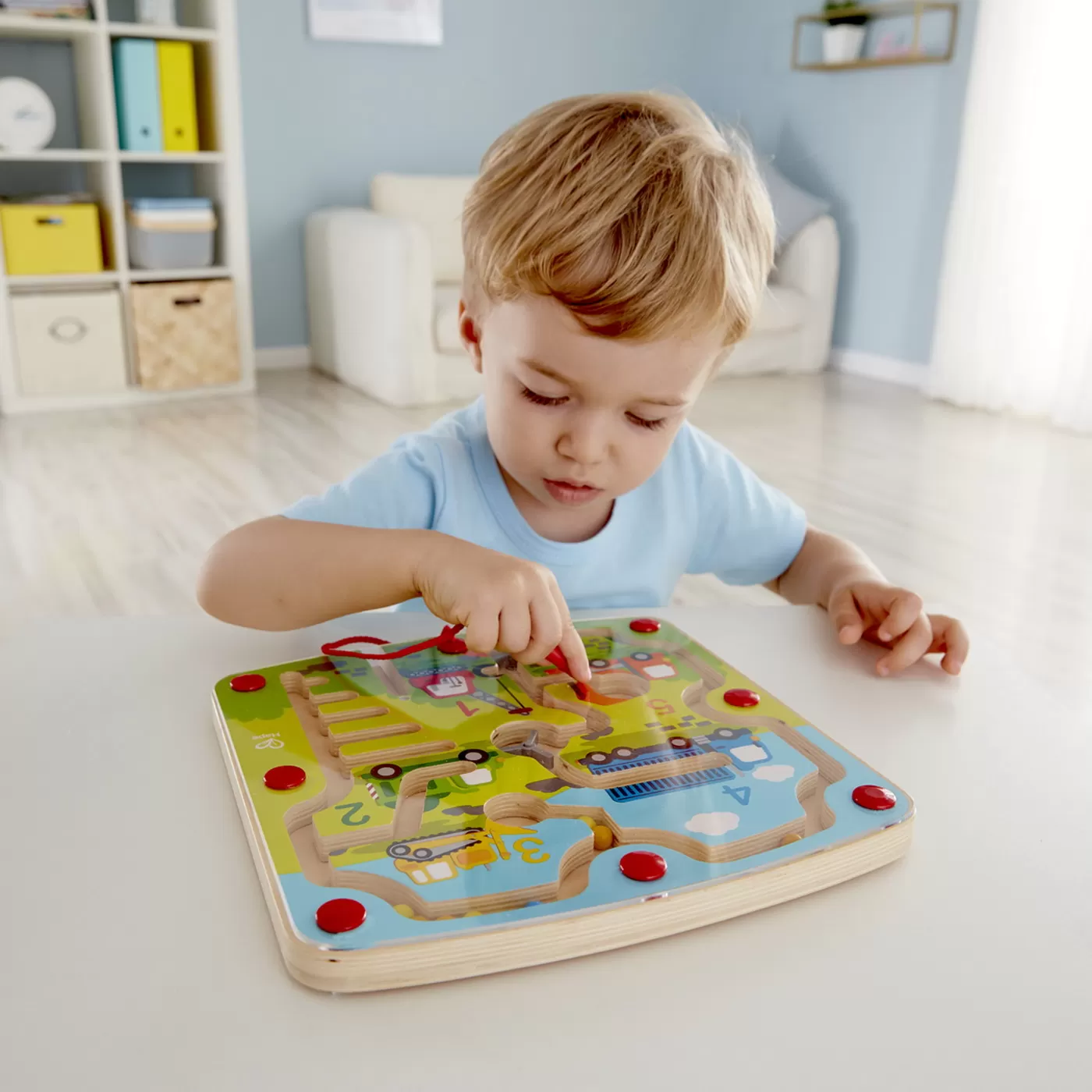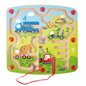 Vedeti cat de repede va puteti gasi drumul prin santierul de constructii si labirintul. Sau puteti incerca sa ajungeti la fiecare vehicul in ordinea numarului sau! inclinati placa pentru a ghida bilele prin labirint sau utilizati bagheta magnetica inclusa!Designul include cinci vehicule de constructie numerotate pentru identificare Excelent pentru dezvoltarea recunoasterii culorilor, coordonarea mainii-ochi si abilitatile de rezolvare a problemelor. Perfect pentru copii interesanti in constructii si inginerie Jucaria are un maner special, pentru a putea fi transportata usor, iar bagheta magnetica este prinsa cu snur, pentru a nu se pierde. Jucariile sunt realizate din lemn, folosind materiale ecologice, vopsite in culori atragatoare cu vopsele nontoxice, care depasesc cele mai inalte si stricte standarde internationale de siguranta si calitate, precum EN71, ISO9001, ASTM F963 si altele. De multi ani, Hape a creat jucarii fantastice, de inalta calitate, folosind materiale ecologice si durabile, fiecare produs fiind atent proiectat pentru a stimula abilitatile senzoriale, fizice si emotionale.