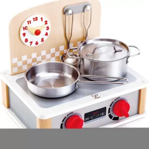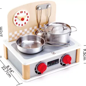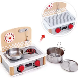 Un set de bucatarie aproape complet la dimensiuni reduse. Copiii se vor bucura de experienta gatitului cu acest set cu aragaz si oale de bucatarie. Vor putea regla temperatura de gatit la butoanele de la aragazul de jucarie din lemn, vor pune mancarea pe foc urmarind atent timpul de coacere si vor amesteca atenti sa nu se prinda. Acest set de aragaz si ustensile de bucatarie de jucarie este perfect pentru spatiile mici. Copiii pasionati de gatit si de joaca de-a bucataria se pot bucura de toate benficiile unei bucatarii de lemn intr-o varianta compacta. Aragazul de jucarie de la HAPE ocupa putin spatiu 25 x 23 cm dar contine 2 ochiuri pentru gatit impreuna cu o oala si o tigaie de inox, un ceas ajustabil, 2 butoane pentru pornit si oprit aragazi si o paleta si un polonic pentru gatit. Aragazul de joaca de la HAPE este realizat din lemn de calitate iar ustensilele de bucatarie sunt realizate din inox. Dimensiuni aragaz de lemn de jucarie L 30, W 23, H 25.7 cm Jucariile sunt realizate din lemn, folosind materiale ecologice, vopsite in culori atragatoare cu vopsele nontoxice, care depasesc cele mai inalte si stricte standarde internationale de siguranta si calitate, precum EN71, ISO9001, ASTM F963 si altele. De multi ani, Hape a creat jucarii fantastice, de inalta calitate, folosind materiale ecologice si durabile, fiecare produs fiind atent proiectat pentru a stimula abilitatile senzoriale, fizice si emotionale.