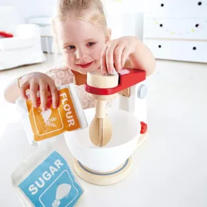 Abia astepti sa cresti si sa devii un adevarat brutar? Mixul & Bake Blender vine complet cu blender de bucatarie, castron, punga cu faina si punga cu zahar. Detalii realiste, cum ar fi butonul mixerului care poate fi rotit pentru a activa blenderul si cadranul care poate fi rasucit pentru distractie, vor inspira imaginatia copilului dumneavoastra. Jucariile sunt realizate din lemn, folosind materiale ecologice, vopsite in culori atragatoare cu vopsele nontoxice, care depasesc cele mai inalte si stricte standarde internationale de siguranta si calitate, precum EN71, ISO9001, ASTM F963 si altele. De multi ani, Hape a creat jucarii fantastice, de inalta calitate, folosind materiale ecologice si durabile, fiecare produs fiind atent proiectat pentru a stimula abilitatile senzoriale, fizice si emotionale.