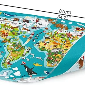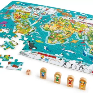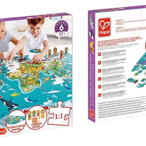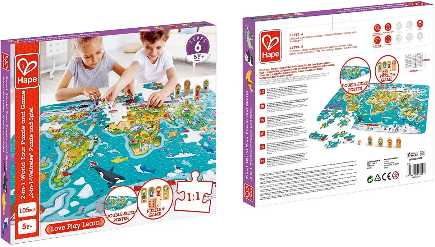 Concureaza-ti cu prietenii din intreaga lume cu acest joc distractiv doi in unu. Mai intai finalizati puzzle-ul din 100 de piese care arata tarile lumii. Apoi, folositi personajele din lemn pentru a calatori pe fiecare continent. Include un poster pe doua fete. Completati puzzle-ul si aflati despre diferitele natiuni, viata salbatica si reperele lor. Foloseste cele patru personaje din lemn si zarurile pentru a juca un joc de curse in jurul lumii. Afisul contine instructiuni despre joc si mai multe informatii despre tari. Include 100 de piese de carton, 4 figuri de joc din lemn, 1 zar si un poster pe doua fete cu o harta a lumii si instructiuni de joc. Doua optiuni de joc diferite maresc oportunitatile de joc Ajuta copiii sa invete despre geografia lumii si sa dezvolte abilitati de rationament. Jucariile sunt realizate din lemn, folosind materiale ecologice, vopsite in culori atragatoare cu vopsele nontoxice, care depasesc cele mai inalte si stricte standarde internationale de siguranta si calitate, precum EN71, ISO9001, ASTM F963 si altele. De multi ani, Hape a creat jucarii fantastice, de inalta calitate, folosind materiale ecologice si durabile, fiecare produs fiind atent proiectat pentru a stimula abilitatile senzoriale, fizice si emotionale.