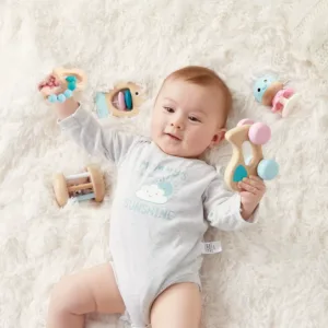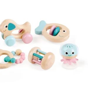 Aceasta colectie minunata de 5 jucarii creste odata cu micutii tai si ajuta la dezvoltarea lor la fiecare pas. Setul contine o zornaitoare in forma de caracatita cu ventuza, ce se poate prinde pe masa, o zornaitoare rotativa, o jucarie de dentitie cu margele pentru bebelusi, o zornaitoare in forma de peste si un catelus pe roti. Acest set este perfect perfect pentru dezvoltarea senzoriala, incurajand coordonarea ochi-mana, abilitatile motorii fine si dezvoltarea muschilor. Zornaitoarele sunt, de asemenea, un instrument excelent pentru dezvoltarea timpurie a constientizarii auditive. Jucariile sunt realizate din lemn, folosind materiale ecologice, vopsite in culori atragatoare cu vopsele nontoxice, care depasesc cele mai inalte si stricte standarde internationale de siguranta si calitate, precum EN71, ISO9001, ASTM F963 si altele. De multi ani, Hape a creat jucarii fantastice, de inalta calitate, folosind materiale ecologice si durabile, fiecare produs fiind atent proiectat pentru a stimula abilitatile senzoriale, fizice si emotionale.