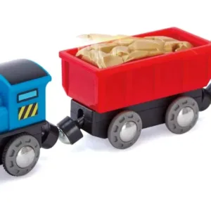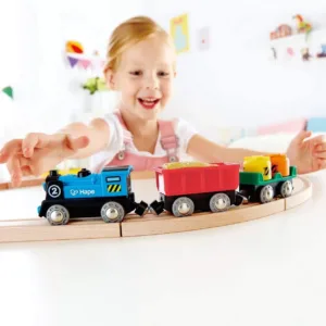Porniti trenul si puneti-l pe pista. Priveste incarcatura dintr-o masina saltand sus si jos , in timp ce pompele din cealalta masina se invart jur imprejur. Locomotiva alimentata cu baterie cu doua vagoane de marfa. Jucariile sunt realizate din lemn, folosind materiale ecologice, vopsite in culori atragatoare cu vopsele nontoxice, care depasesc cele mai inalte si stricte standarde internationale de siguranta si calitate, precum EN71, ISO9001, ASTM F963 si altele. De multi ani, Hape a creat jucarii fantastice, de inalta calitate, folosind materiale ecologice si durabile, fiecare produs fiind atent proiectat pentru a stimula abilitatile senzoriale, fizice si emotionale.
