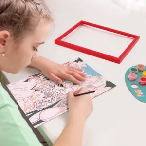 Setul include 1 cartonas preimprimat cu un model de iepuras, 10 vopsele acrilice in borcane de plastic, 1 rama din plastic, 1 pensula. Tema iepuras vesel. Copilul vede ce culoare corespunde fiecarei zone si o picteaza in consecinta. Rezultatul este foarte satisfacator, deoarece colorarea cartonului este ghidata.