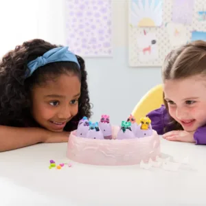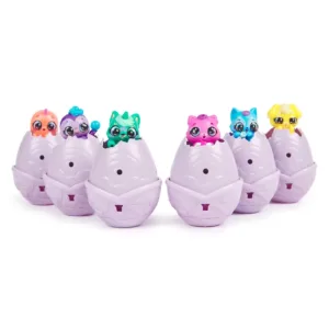 Dati viata curcubeului cu Hatchimals Alive Iesit din Curcubeu. Cu dragoste si grija, Hatchimals Rainbow Splash iau viata intr-un nou mod colorat oua care eclozeaza in apa, schimband culoarea apei pentru a se potrivi cu personajul din interior. Curcubeul Rainbow Hatchery include 6 personaje in oua, 6 perechi de aripi, 6 accesorii de crestere si un cuib. Pentru a incepe eclozarea, asezati ouale in cuib si scoateti-le aripile, apoi umpleti incet inima cu apa. În cateva secunde, apa va incepe sa isi schimbe culorile, rotindu-se intr-un curcubeu fascinant, in timp ce fiecare personaj incepe sa sparga ouale. Descoperiti un catelus, un unicorn, un pinguin si multe altele. Jucati-va in interiorul cuibului pe tobogan, luati masa in scaunul inalt si folositi accesoriile de ingrijire, cum ar fi suzeta, castronul si lingura, biberonul si multe altele, pentru povestiri nesfarsite. Cei carora le plac figurinele de actiune, jucariile de mici dimensiuni, papusile si jocurile cu casa de papusi vor adora jucariile surpriza Hatchimals. Cadouri amuzante pentru zile de nastere, cadouri pentru ocazii speciale, cadouri pentru umplerea ciorapilor sau cadouri pentru orice ocazie. Aduceti curcubeul cu Hatchimals Alive Iesit din Curcubeu.