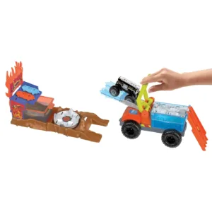 Actiunea de schimbare a culorii este in flacari cu setul de joc Hot Wheels Monster Trucks Arena Smashers Color Shifters 5-Alarm Rescue. Copiii conduc Color Shifters HW 5-Alarm inclus in rezervorul de apa rece ca gheata al unei platforme detasabile pentru a initia prima schimbare de culoare inainte de a tinti spre un zid de flacari din spatele unei tribune. Loviti locul zdrobitor si 5-Alarm se prabuseste in tribune cele doua masini zdrobibile incluse si Monster Truck cad in apa foarte calda si 5-Alarm isi schimba culoarea inca o data! Întoarceti unitatea de rotatie pentru a scutura excesul de apa inainte de a repeta provocarea! Culorile si decoratiunile pot varia.