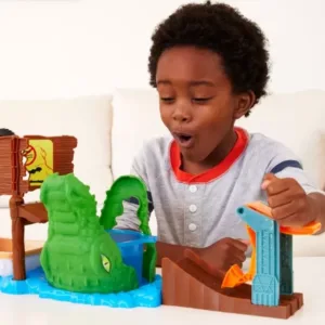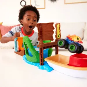Cu setul de joc Hot Wheels® Monster Trucks Swamp Chomp&trade Color Shifters&trade, zdrobirea si prabusirea ofera un val de surprize de schimbare a culorii pentru senzatii tari si emotii masive! Lansati Color Shifters&trade Piran-ahhh&trade inclus si atunci cand cade in gura aligatorului plina de apa inghetata, initiaza o schimbare de culoare care ofera camionului un aspect cu totul nou. Relansati camionul, si in timp ce zdobeste semnul cade pe o barca, unde poate fi stropit cu apa calda pentru a schimba din nou decorul! Repetati cascadoriile pentru a repeta modificarile! Barca detasabila si cupa din gura aligatorului previn scurgerile si pastreaza apa in zona de joaca. Culorile si decoratiunile pot varia.