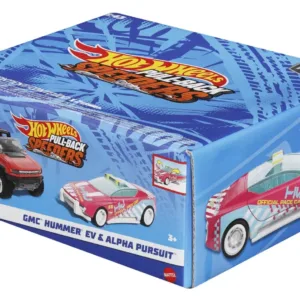 Pachetul de 2 masini cu cu sistem pull back de la Hot Wheels Speeders promit curse interesante. Masinile pot fi trase inapoi si eliberate pe podele si covoare pentru o cursa interesanta. Toate masinile la scara 143 ofera o caracteristica interactiva grozava, de ex. Rolomatice pentru usi, clapete de portbagaj si capote care pot fi deschise.Decoratiunile detaliate fac ca inimile copiilor si colectionarilor sa bata mai repede. Vehiculele Hot Wheels Speeders sunt un cadou grozav pentru copiii de la 3 ani in sus. Acest pachet contine masinutele GMC Hummer EV si Alpha Pursuit.