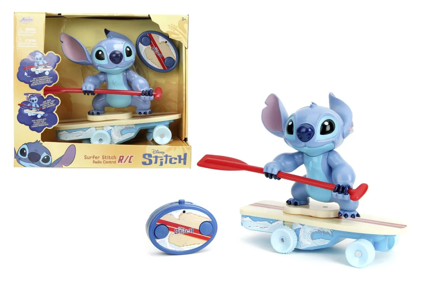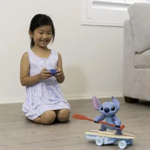 Stitch prinde valoare cu un stil unic! Figurina Stitch cu placa de surf cu telefcomanda aduce energia personajului indragit direct in joaca celor mici. Asezat pe placa sa de surf si tinand pagaia rosie, Stitch este pregatit sa porneasca in aventura, iar telecomanda permite controlul directiei si miscarii. Placa se deplaseaza fluid, iar Stitch se inclina usor in timpul mersului pentru un efect realist si amuzant. Designul colorat, detaliile atent realizate si miscarea controlata transforma joaca intr-o experienta interactiva si captivanta. Perfect pentru fanii Disney si pentru copii care adora jucarii dinamice, Surfer Stitch RC este alegerea ideala pentru ore intregi de distractie. Necesita baterii.