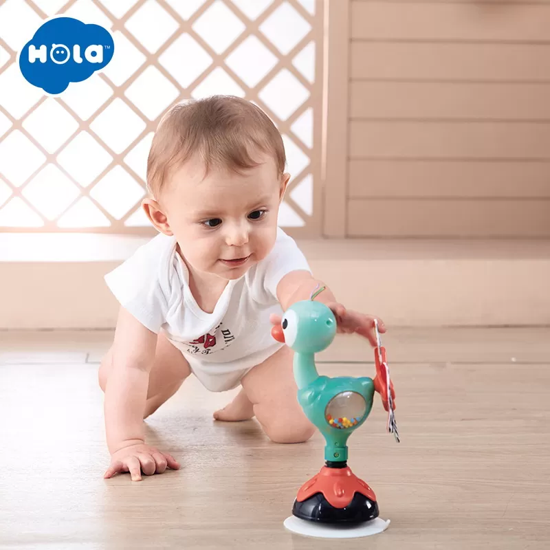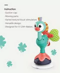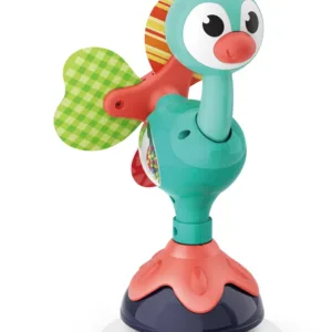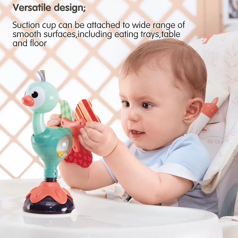 Jucaria Bebe Paun cu ventuza are parti mobile, texturi variante, culori diferite pentru stimulare vizuala si un design versatil si atragator. Jucaria se poate monta masa copilului, pe scaunul lui de masa, pe parchet sau alte suprafete plane. Jucaria are 5 locuri, in care copilul poate efectua diferite activitatii precum rotirea, tragerea, apasarea, etc.