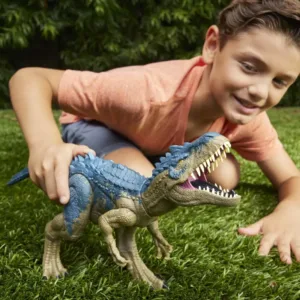 Acest Allosaurus Rampagin' nemilos este o evolutie epica a figurinelor Jurassic World. Este un dinozaur evoluat si pregatit de aventura. Un buton de pe coada ridica in mod spectaculos tepusele de pe spate si coada, creand o imagine impresionanta. Rotita de pe spatele acestui dinozaur activeaza o miscare continua si realista, simbolizand atacuri feroce cu muscaturi si ragete puternice. Allosaurus are tepi pe spate si pe coada care cresc in marime si ferocitate atunci cand butonul este activat. Aceasta jucarie dinozaur este gata sa infrunte orice rival.Pentru a adauga o dimensiune suplimentara de distractie, poti scana codul de urmarire ascuns in aplicatia gratuita Jurassic World Play App cu un dispozitiv inteligent compatibil (Android sau iOS, nu este inclus). Acest lucru deblocheaza experiente AR si jocuri feroce si distractive.Allosaurus Rampagin' nemilos este inaltime de 43 cm si este potrivit pentru copii cu varsta de 3 ani si peste. Este realizat din plastic de inalta calitate si este colorat in mod spectaculos. Jucaria are o functie de sunet ce adauga o nota realista la aventurile imaginare ale copiilor. Bateriile necesare (3x AG13/LR44) sunt incluse in pachet, asa ca nu trebuie sa-ti faci griji in privinta asta.Pentru a completa experienta de joc, poti infasura figurina in folie de cadou si sa o oferi cuiva drag. Allosaurus Rampagin' nemilos este un cadou minunat pentru fanii Jurassic World si poate fi o adaugare excelenta la orice colectie de dinozauri.