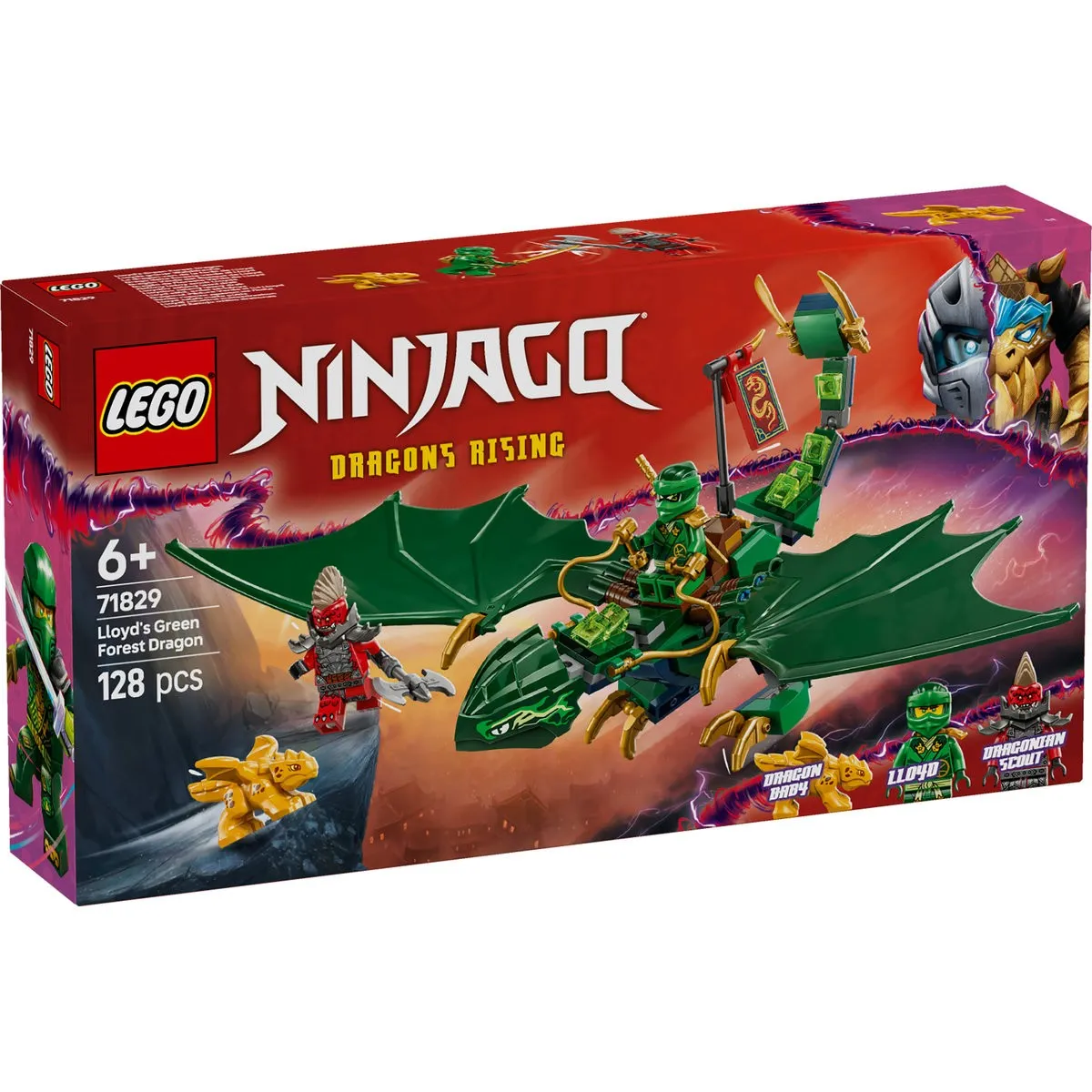 Baietii si fetele in varsta de 6 ani si mai mari isi pot lua zborul la inaltime pentru a recrea scene aeriene din sezonul 3 al serialului TV NINJAGO® Ascensiunea Dragonilor cu jucaria de construit Dragonul de Padure al lui Lloyd (71829). Contine un dragon impresionant cu coada, gat, picioare, aripi mari si maini articulate, plus o sa pe care sa calareasca minifigurina. Acest set LEGO® NINJAGO cu dragon include 2 minifigurine Lloyd inarmat cu o katana aurita si o Santinela Dragonian raufactoare cu un topor, plus un model Bebesut de Dragon aurit, astfel incat copiii sa poata interpreta cum au grija de el. Tema LEGO NINJAGO de jucarii ninja construibile include roboti, vehicule si temple ce ofera copiilor ocazia sa evadeze intr-o lume fantastica a aventurii alaturi de eroii lor ninja. Fiecare set de actiune poate fi creat cu aplicatia LEGO Builder, care te ghideaza pe tine si pe copilul tau intr-o aventura de construit usoara si intuitiva.
