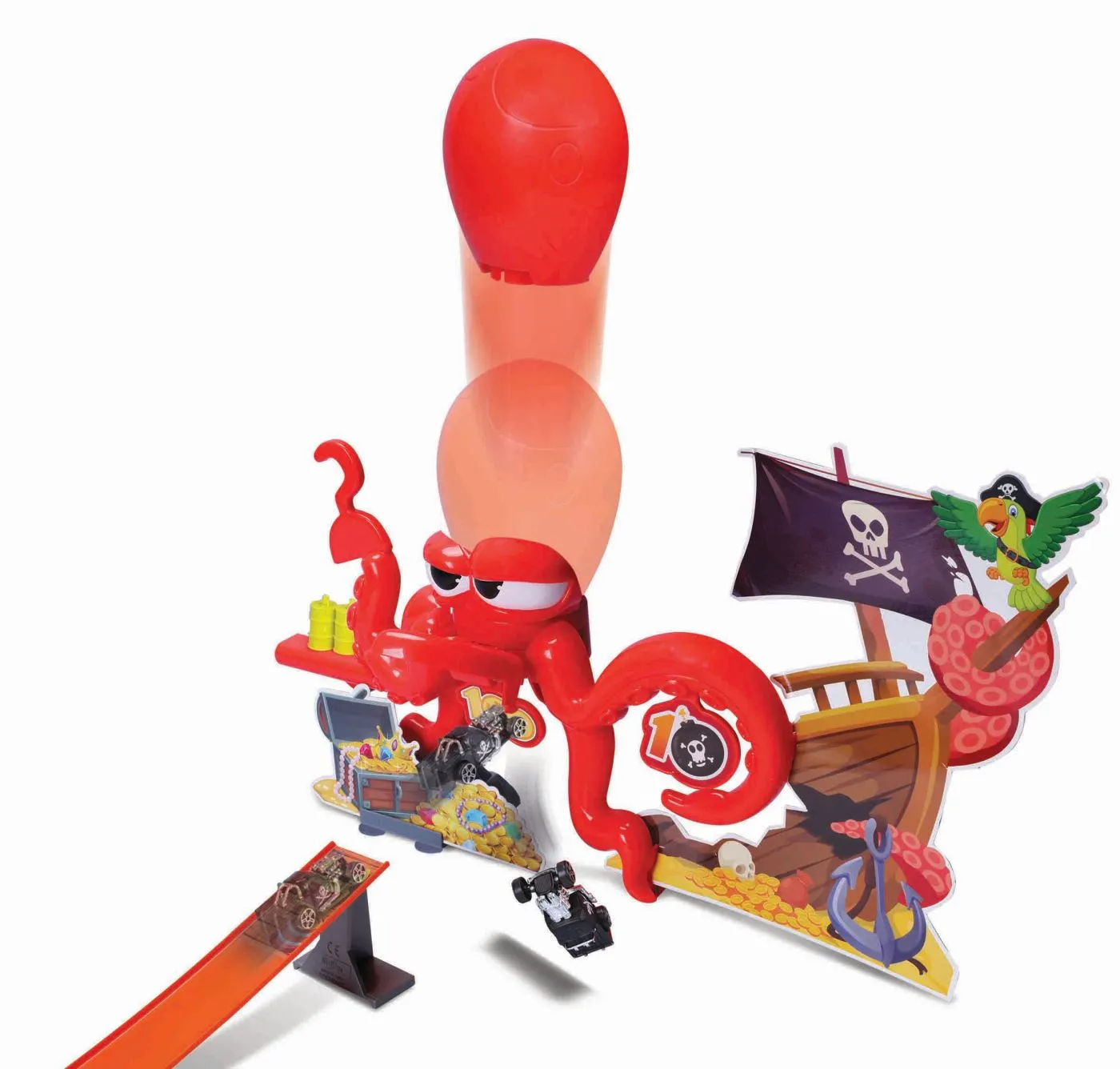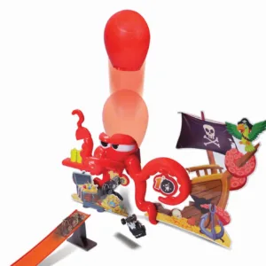 Pregateste-te pentru o misiune plina de actiune si adrenalina cu setul Fresh Metal 100 Octo-Blaster Track Set! Acest set te provoaca sa traversezi un traseu periculos, pazit de un octopod gigant, pentru a ajunge la comoara. Setul include un octopod gigant cu tinte actionate de arcuri si un cap mobil, care adauga un element de provocare si interactivitate. Setul include un lansator din plastic si piese de traseu cu etichete, permitand construirea unui traseu captivant. Octopodul este echipat cu tinte actionate de arcuri, care se declanseaza atunci cand sunt lovite de masinuta. Setul include o masinuta metalica turnata sub presiune (die-cast) de 3 inch, exclusiva pentru acest set. Designul setului, cu octopodul gigant si elementele de traseu, creeaza o atmosfera tematica subacvatica. Setul este prezentat intr-o cutie cu fereastra, permitand vizualizarea continutului si oferind o optiune excelenta pentru cadou. Setul Fresh Metal 100 Octo-Blaster Track Set este o alegere excelenta pentru cei care iubesc aventurile pline de actiune si provocari. Cu octopodul sau gigant, tintele interactive si masinuta metalica exclusiva, acest set promite ore de distractie si aventura subacvatica.