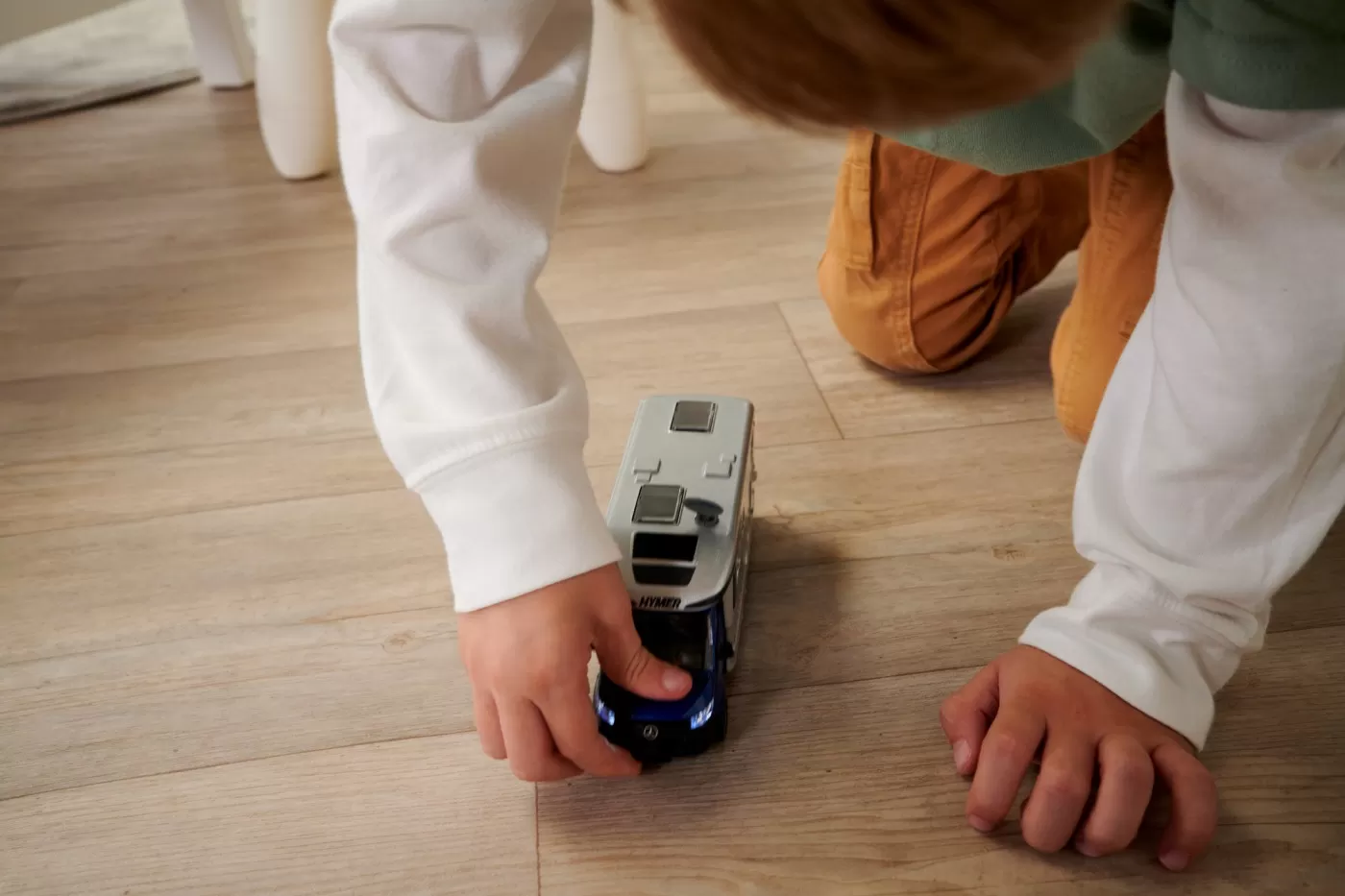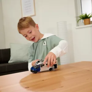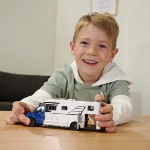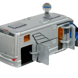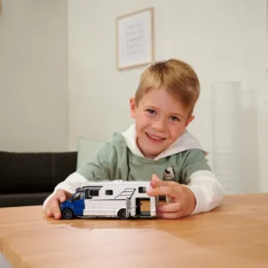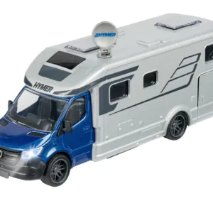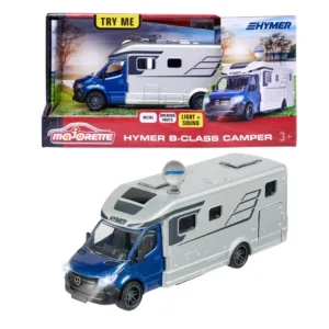 Majorette Camper van HYMER B-Class MasterLine rulota premium la scara 143, vehicul de jucarie pentru colectionari si copii cu varsta de 3 ani si peste. Proiectat pe baza vehiculului original, modelul are o multime de functii practice si realiste pentru a va distra, inclusiv doua efecte sonore diferite, doua faruri si iluminare interioara. De asemenea, dispune de anvelope din cauciuc moale, cu un model de benzi de rulare, ferestre transparente si antena de satelit rotativa pliabila. Atat cabina soferului, cat si sectiunea de rulota sunt realizate din metal. Celelalte parti sunt fabricate din plastic.