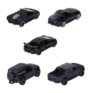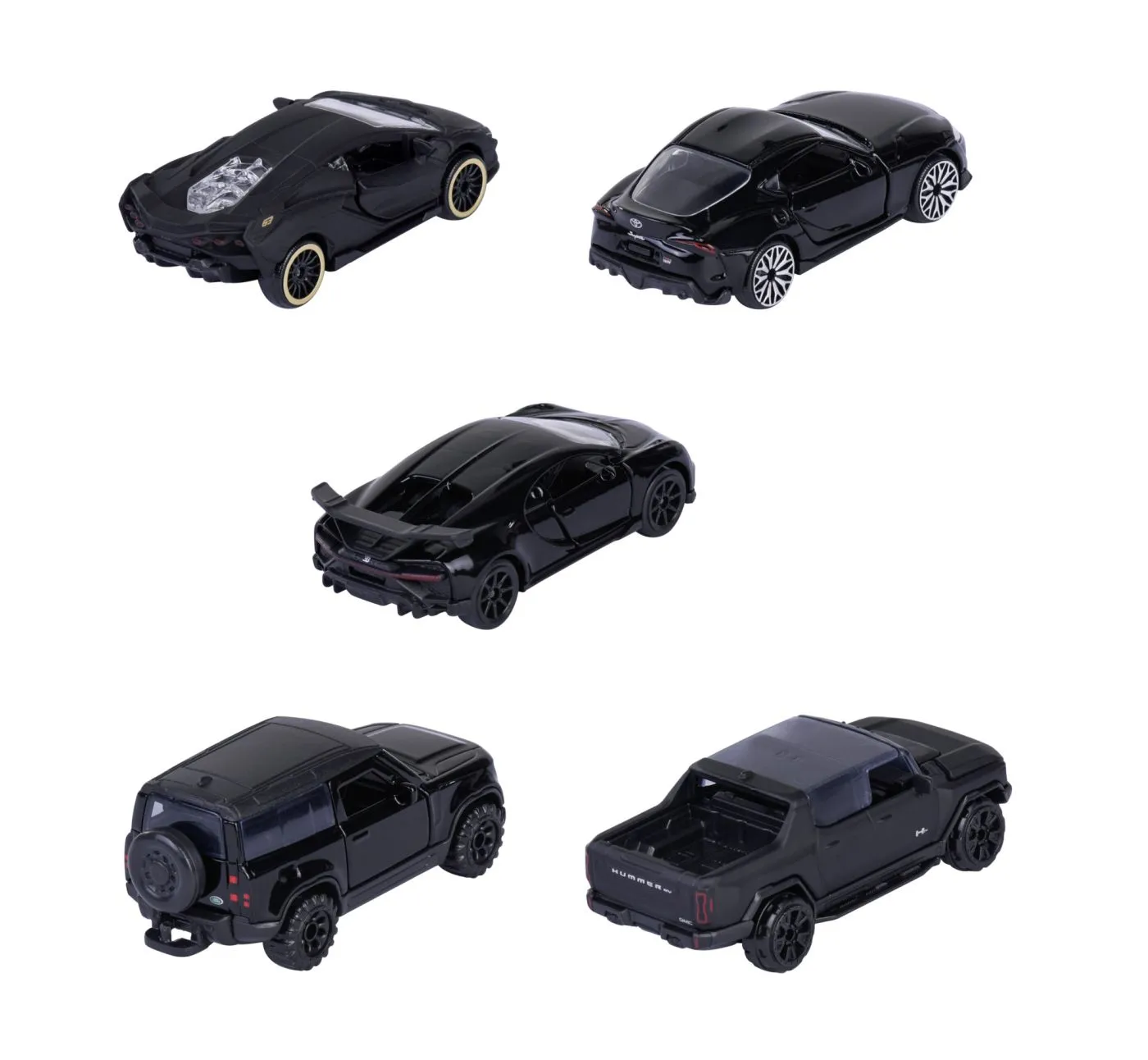 Majorette Car Set Black Edition (5 masini) – 5 masini model din metal negru cu roata libera, suspensie si deschidere, masini de jucarie pentru colectionari si copii de la 3 ani si peste, fiecare 7,5 cm. Setul cadou combina 5 masini metalice licentiate 1. Bugatti Chiron Pur Sport, 2. Lamborghini Si&aacuten FKP 37, 3. Toyota GR Supra, 4. Land Rover Defender 90 si 5. GMC Hummer EV.