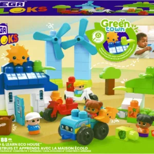 Acest kit contine 88 de blocuri mari, inclusiv piese speciale, 2 roti de rulare si o masina de jucarie electrica construibila cu 1 sasiu rulant, realizata din materiale plastice din surse durabile.Copiii mici pot construi o casa, 4 figurine, o masina electrica de jucarie, o sera cu legume, panouri solare si turbine eoliene rotative.Conceput special pentru mainile mici, acest kit incurajeaza micii constructori sa gandeasca verde, cum ar fi energia regenerabila, joaca in aer liber si consumul de energie.