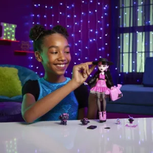 Papusa Monster High Draculaura arata uimitor intr-o tinuta adorabil de infricosatoare! Ea vine cu animalul sau de companie, Count Fabulous, precum si cu accesorii infricosatoare.Draculaura poarta un top roz stralucitor cu maneci bufante negre transparente si o fusta asortata. O palarie, sosete negre si cizme roz completeaza aspectul ei!Pisica-liliac infricosatoare Count Fabulous este, de asemenea, teribil de eleganta, cu o fundita roz si un guler! Copiii pot imagina aventuri nesfarsite cu acest animal de companie dulce si infricosator.