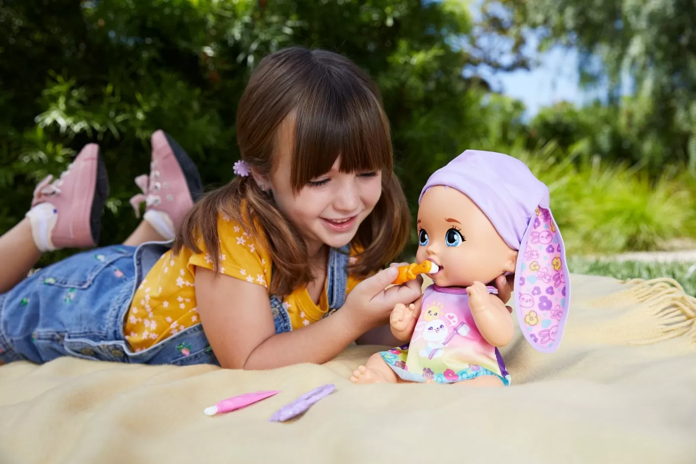 Papusa My Garden Baby Brush & Smile Little Bunny Baby ofera jocul clasic de papusi pentru bebelusi intr-un mod fantastic!Nascut cu urechi moi si un dulce parfum floral, acest iepuras vrea doar sa fie ingrijit.Periati dintii papusii My Garden Baby cu periuta de dinti si capul se misca dintr-o parte in alta!tinuta adorabila cu palariuta moale si tinuta reversibila 2 in 1 pentru o joaca de ingrijire de la zi la noapte.Trezeste bebelusul, spala dintii, linisteste-l cu ajutorul dispozitivului de dentitie reversibil, leagana-l pana adoarme!Cutia de ambalare devine un patut in care My Garden Baby poate sari in vise dulci.