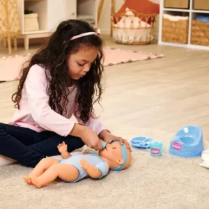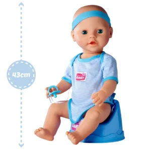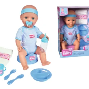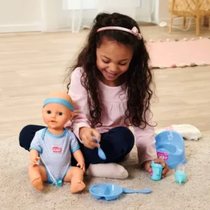 Papusa este imbracata in salopeta, are o banderola cu o fundita. Papusa poate bea si face pipi pe olita. Setul include tot ce este necesar pentru ingrijirea papusii. Poti s-o hranesti, sa-i dai o suzeta, sa-i schimbi scutecul si s-o pui pe olita