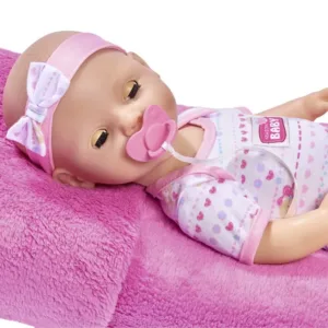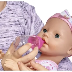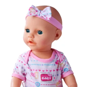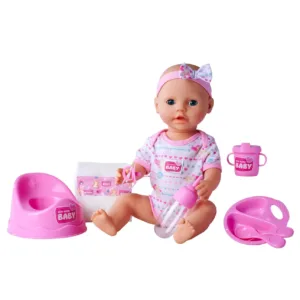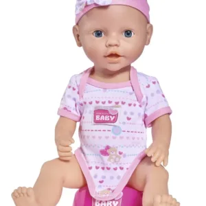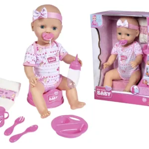 Setul include tot ce este necesar pentru ingrijirea papusii. Poti s-o hranesti, sa-i dai o suzeta, sa-i schimbi scutecul si s-o pui pe olita. Papusa este imbracata in salopeta, are o banderola cu o fundita. Papusa poate bea si face pipi pe olita. Inaltime 43 cm. Setul include papusa, sticla, biberon, ceasca, castron, lingurita, furculita, scutec