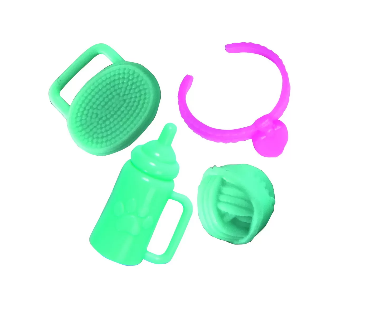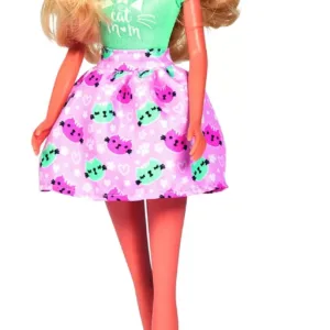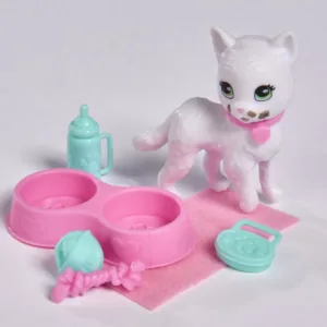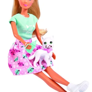 Steffi poarta o rochie la moda, si pleaca la plimbare impreuna cu pisicuta ei, plus multe accesorii, Inaltime papusa 29cm. Papusa Steffi are grija de pisicuta. Poarta o rochie verde si roz, cu pisici si pantofi albi. Pisicuta este alba si are fata murdara. Este suficient sa umeziti carpa atasata setului cu apa calda si sa stergeti gura, iar murdaria va disparea. Accesoriile pentru ingrijirea unui animal de companie includ un castron pentru mancare si apa, o minge de lana, o sticla.
