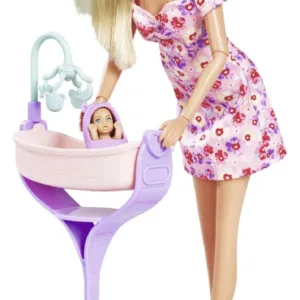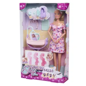 Noua papusa Steffi LOVE este insarcinata si poti sa-i vezi burtica cum creste si creste pana cand copilul se naste. Daca butonul de pe spatele lui Steffi este apasat, stomacul ei incepe sa creasca. Dupa a noua apasare, copilul lui Steffi vine pe lume! Setul include si un pat pentru bebelusi si o multime de alte accesorii pentru copii pentru ingrijire.