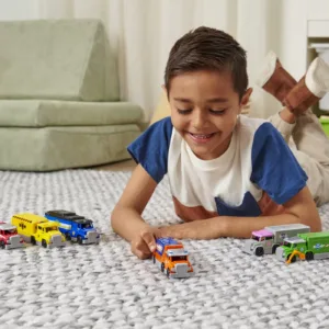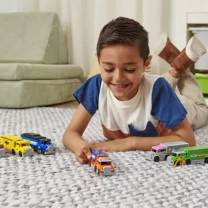 Vehicule metalice Patrula Catelusilor la scara 155, din metal cu tema Marile Camioane. Aceste camioane sunt in forma lor de spectacol al patrulei Catelusilor din metal turnat si roti rulante. Puteti obtine toata actiunea camioanelor din segmentul turnat. Copiii pot scana codul QR de pe pachet pentru a vedea posterul de colectie si pentru a urmari vehiculele lor True Metal, de la masini de curse Mighty Pups si PAW Patrol Movie, la super rare si multe altele. Acest pachet contine personajul Skye.