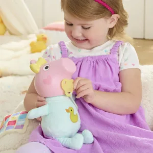 Sora mica a Peppei Pig, Evie, este aici! Copiii isi pot recrea scenele preferate din serial cu papusa interactiva Oinks and Snuggles Evie, cu accesorii. Activeaza peste 20 de efecte sonore diferite dandii suzeta sau biberonul fictiv, sarindo in sus si in jos sau culcandoo jos pentru un pui de somn simulat. Accesorii dragute, cum ar fi un covoras de joaca, o bavetica si o patura pentru bebelusi, contribuie la joaca reconfortanta. Jucariile Peppa Pig, precum Oinks and Snuggles Evie, sunt cadouri grozave pentru fete si baieti de 3 ani si peste care iubesc serialul animat sau care devin frati si surori mai mari. Cauta mai multe figurine si seturi de joaca Peppa Pig cu bebelusul Evie (fiecare se vinde separat, in functie de disponibilitate) pentru mai multa distractie in familie Peppa Pig!