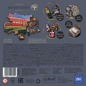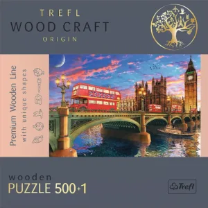 Esti un pasionat de puzzle-uri? Puzzle-urile din lemn WOOD CRAFT de la Trefl au fost create doar pentru tine! Folosind formatul unic de puzzle si figurile puzzle originale, asamblati setul. uzzle-urile din lemn cu forme neregulate sunt o alternativa ideala la puzzle-urile traditionale. Setul este format din 500+1 elemente printre care au fost ascunse pana la 50 de piese de puzzle in diferite forme. Gasirea lor este o mare distractie suplimentara! Fiecare piesa de puzzle are un model decorativ pe verso. Bucurati-va de calitatea inalta a maiestriei, observati intensitatea culorilor si detaliile atragatoare. Puzzle-urile din lemn WOOD CRAFT ii vor impresiona pe iubitorii de puzzle-uri care cauta o noua dimensiune a divertismentului. Antreneaza-ti memoria si abilitatile de gandire logica si dezvolta-ti creativitatea. Puzzle-urile au fost fabricate folosind materiale de inalta calitate. Din grija pentru mediu, am redus cantitatea de plastic prin producerea ambalajelor in intregime din carton.O serie exceptionala! Puzzle din lemn creat pentru cei care apreciaza maiestria fina, estetica si solutiile moderne. Rezolva puzzle-ul si fa cea mai rapida excursie la Londa.Pana la 50 de figuri unice de puzzle care infatiseaza simboluri si monumente englezesti. Modelul decorativ de pe verso poate fi admirat de fiecare iubitor de puzzle-uriUn joc pentru o memorie excelenta si antrenament pentru o gandire creativa. Exersati-va perceptivitatea si dezvoltati abilitatile manualePuzzle cu forma neregulata va crea o imagine de 375 x 254 mm. Piese de puzzle vin ambalate intr-o punga de hartie ecologica si ambalaj de carton. Puzzle conceput pentru adulti si copii peste 12 ani.