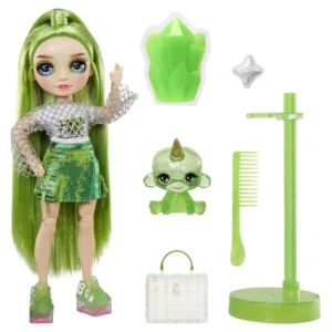 Rainbow High inspira copiii sa fie creativi. Curcubeul straluceste puternic, la fel si noile papusi Classic Rainbow! Descopera si joaca-te cu Jade Hunter intr-un nou mod fantastic! Acum, cu Liquid Rainbow Slime exista mai multa culoare, mai multa stralucire, mai multe modalitati de joaca! Si, pentru prima data, papusa ta preferata vine cu propriul animal de companie, care, de asemenea, straluceste!Jade Hunter este articulata pentru scenarii de joaca nelimitate si pline de farmec!Vine cu o tinuta completa inclusa si accesorii. Jade este imbracata din cap pana in picioare in verde!Pentru prima data, Jade are adorabilul ei animal de companie magic cu corn – Sweetpea. Pentru a schimba culoarea animalutului, ii poti umple corpul cu slime.Jade Hunter vine cu pantofi draguti si o geanta pe care le poti personaliza si carora le poti schimba culoarea adaugand niste slime.Are trasaturi superbe si detaliate si par frumos!Include o papusa cu tinuta completa, pantofi, geanta, animal de companie, slime si sclipici.Colectioneaza toate papusile Rainbow High din gama Classic Rainbow si vei avea toate culorile curcubeului! Fiecare papusa are propriul stil care ii exprima perfect personalitatea. De asemenea, fiecare papusa vine cu culoarea de slime asortata rosu, portocaliu, galben, verde, albastru, violet sau roz. Exista o multime de moduri de a-ti imagina o joaca distractiva si creativa cu aceste papusi! Imbraca-le in fiecare look, iar daca ai doua sau mai multe papusi din gama Classic Rainbow le poti schimba si asorta piesele vestimentare intre ele!
