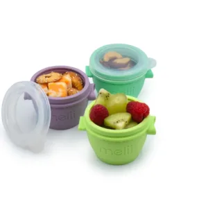 Set 4 recipiente silicon Snap&Go, Melii, 4×177 ml Congelarea portionata a hranei pentru bebelusi nu a fost niciodata mai rapida! Pur si simplu turnati mancarea pentru bebelusi in recipiente, puneti-le in congelator si, cand aveti nevoie, RUPEtI o cutie pentru a decongela! Aceste capsule colorate nu sunt doar distractive pentru copii, ci si practice pentru parinti – capsulele se pot atasa orizontal sau vertical, facilitand incadrarea in congelator, in orice configuratie. Aceste capsule cresc odata cu copii, fiind disponibile in mai multe dimensiuni si pot fi folosite mult timp dupa faza de piure. Folositi-le ca recipiente distractive pentru gustari, punand o gustare diferita in fiecare dintre cele 4 compartimente, atasati-le intr-o singura linie lunga si serviti sau utilizati-le pentru gustari portionate inteligent intr-o cutie de pranz, posibilitatile sunt nelimitate! CARACTERISTICI PRODUS 4 containere detasabile si usor de stivuit, colorate in mai multe culori Recipientele se pot atasa orizontal sau vertical Capac ermetic si antipicurare pentru a preveni varsarile si inghetarea in congelator Sigur pentru cuptorul cu microunde, congelator si masina de spalat vase pe raftul superior Fara BPA, plumb, PVC, cadmiu, ftalati Disponibile in dimensiuni de 59 ml, 118 ml, 180 ml