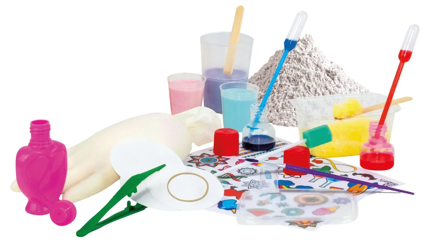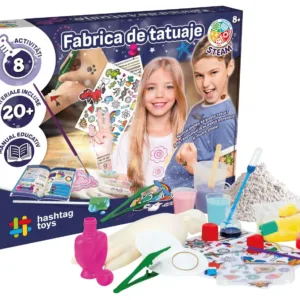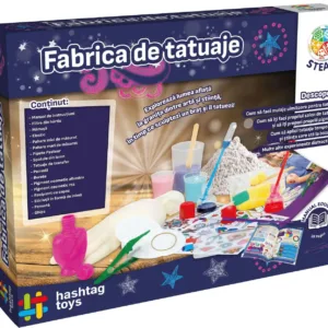 Creeaza-ti propriile tatuaje cu aceasta Fabrica de tatuaje! Nu rata sansa de a-ti pregati propriile cerneluri si de a descoperi originea si stiinta din spatele tatuajelor temporare. Vei gasi, de asemenea, peste 60 de tatuaje gata de aplicat pentru tine sau prietenii tai! Continutul setului banda elastica, manusa, filtre de hartie, cupe mici gradate, pipete Pasteur, cupa mare gradata, spatule din lemn, pensula, colorant cosmetic albastru, colorant cosmetic roz, ghips, recipient cu capac, sticluta in forma de inima, penseta, burete, tatuaje prin transfer.