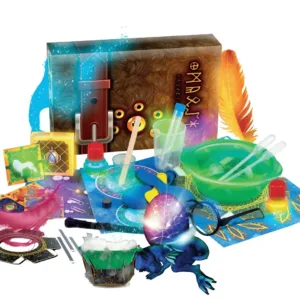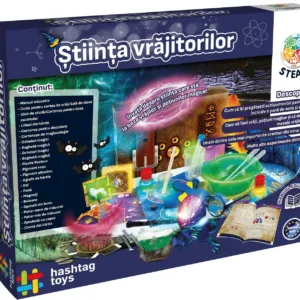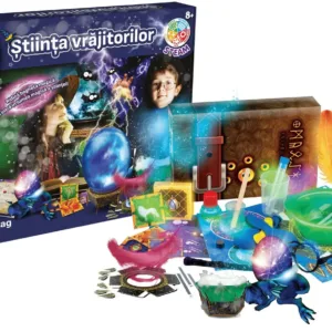 Set stiinta vrajitorilor. Ti-ai imaginat vreodata ca intri intr-o scoala a vrajitoriei stiintifice? Invata cum sa faci obiectele sa leviteze la ora de farmece si cum sa creezi cerneala invizibila si culori teleportante la ora de potiuni! Daca dovedesti ca esti un adevarat vrajitor, s-ar putea chiar sa descoperi creaturi magice si sa inveti cum sa faci un ou de dragon! Continutul kitului cutie de magie (forma de carte / clasa), pana, ochelari de vrajitor, carduri MagiZoologie, card pentru decodificare, baza pentru bila de cristal / cazan, pipete Pasteur, lilieci din hartie, magneti, agrafe de hartie, accesorii suplimentare balonase, cupa mare gradata, spatula din lemn, cupa mica gradata, bol, eprubeta cu capac, colorant rosu, colorant albastru, capsator de hartie.