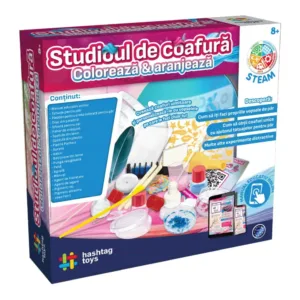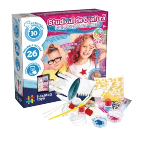 Creeaza-ti propriile vopsele de par si fa-ti tatuaje fantastice cu acest STUDIO DE COAFURA COLOREAZA SI ARANJEAZA care te va introduce in lumea modei! Vei invata cum sa realizezi diferite coafuri si sa iti colorezi parul cu nuante unice, pe care le poti schimba dupa o singura spalare! Pune-ti creativitatea la incercare si descopera activitatile experimentale care iti vor face parul sa stea &bdquoin varful capului&rdquo de uimire! Continutul setului tatuaje pentru par, snururi colorate pentru par, disc de parafina, spatule din lemn, spatula din plastic, cupa gradata, pipeta Pasteur, burete, creta tip pieptene colorat, balon, betisoare din lemn.