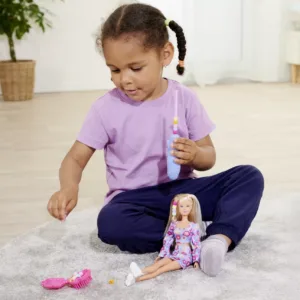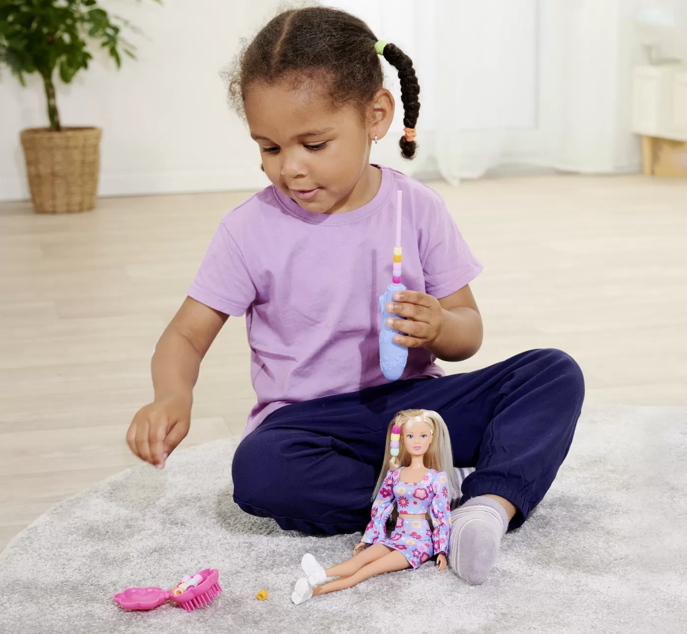 Lui Steffi ii place sa-si coafeze parul si sa incerce coafuri noi. Cu betisorul de perle isi pune perle colorate in par. Pentru a face acest lucru, atasati mai intai o banda de cauciuc, apoi margelele de tija, trageti ochiul si impingeti margelele pe o suvita de par. Functioneaza si in parul copiilor. Pe langa diverse margele colorate si elastice, setul contine si o perie roz cu design floral pentru pieptanat parul.